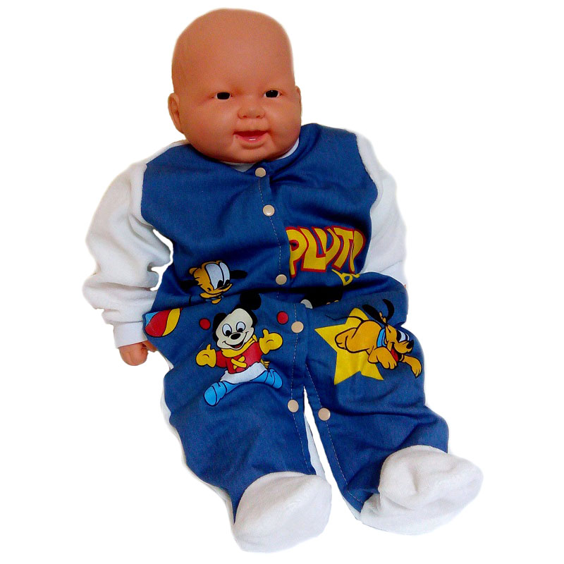 Комбинезон без воротничка, с закрытыми ножками, с рукавами на манжете. Сзади комбинезон выполнен из велюра белого цвета, спереди из джинса и украшен героями из мультфильмов.