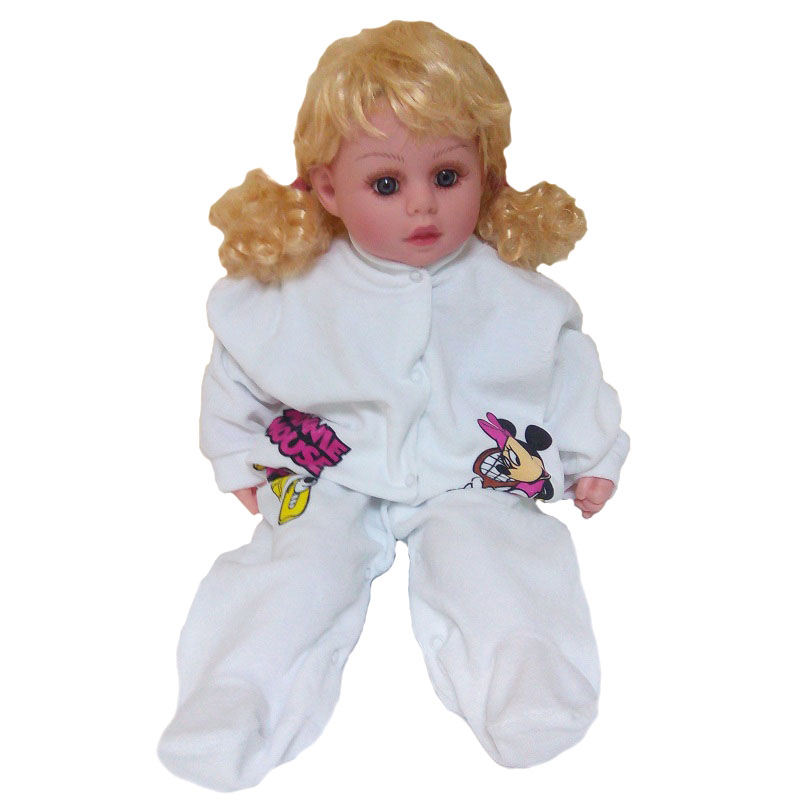 Комбинезон из велюра белого цвета без воротничка, с закрытыми ножками, с длинными рукавами на манжете, спереди и между ножек на кнопочках. Комбинезон спереди украшен рисунками мультгероев.